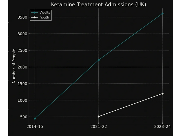 In the year ending March 2024, ketamine seizures by police in England and Wales increased by 51%, reaching 2,252 incidents - the highest since records began in 2006. [5]